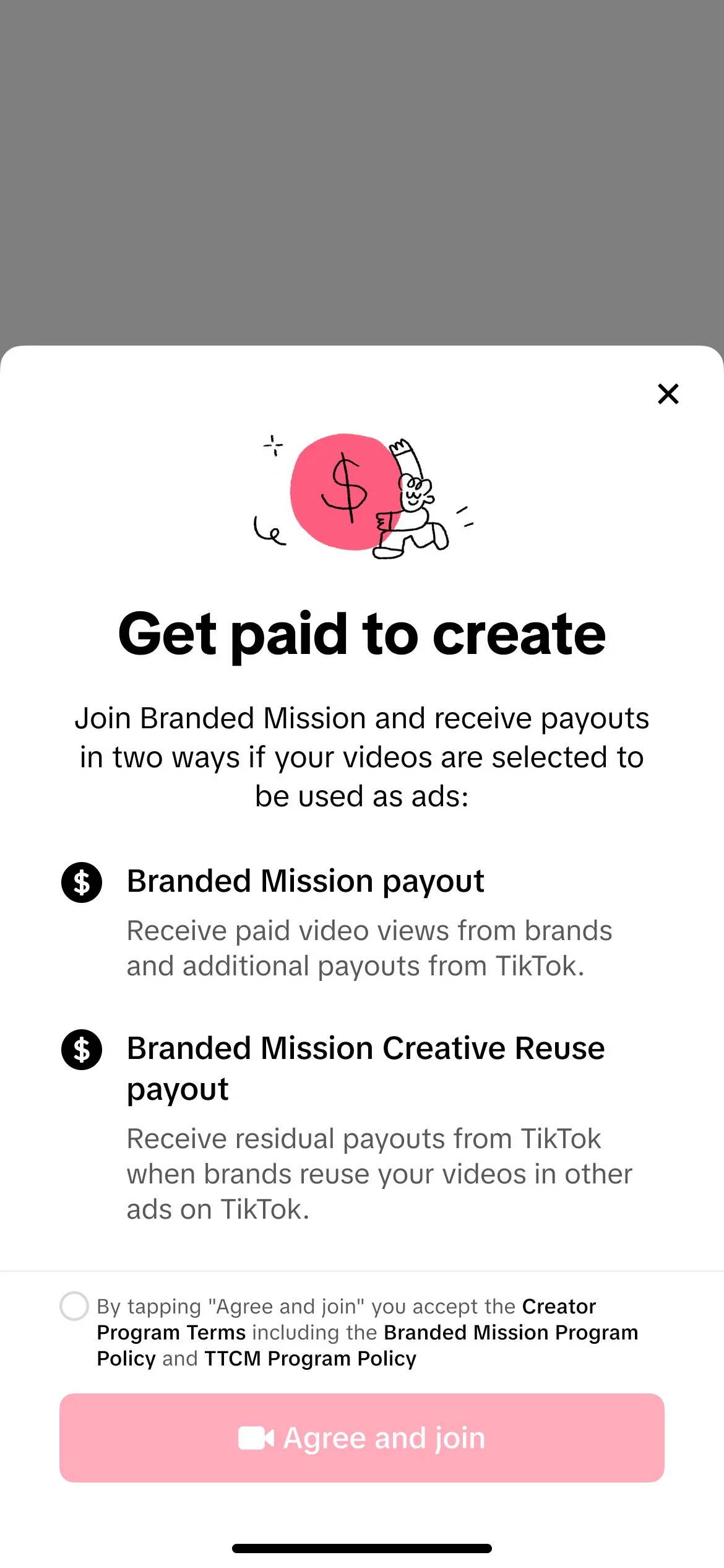 After the team’s designer left, I quickly stepped in to surface the new signup page for Branded Mission. The flow was kept simple: creators would tap the "Agree and join" CTA on the Mission detail page, triggering a half-sheet page where they could register for the program. This page highlighted a new introduction message showcasing the two key monetization opportunities Branded Mission offers to creators.