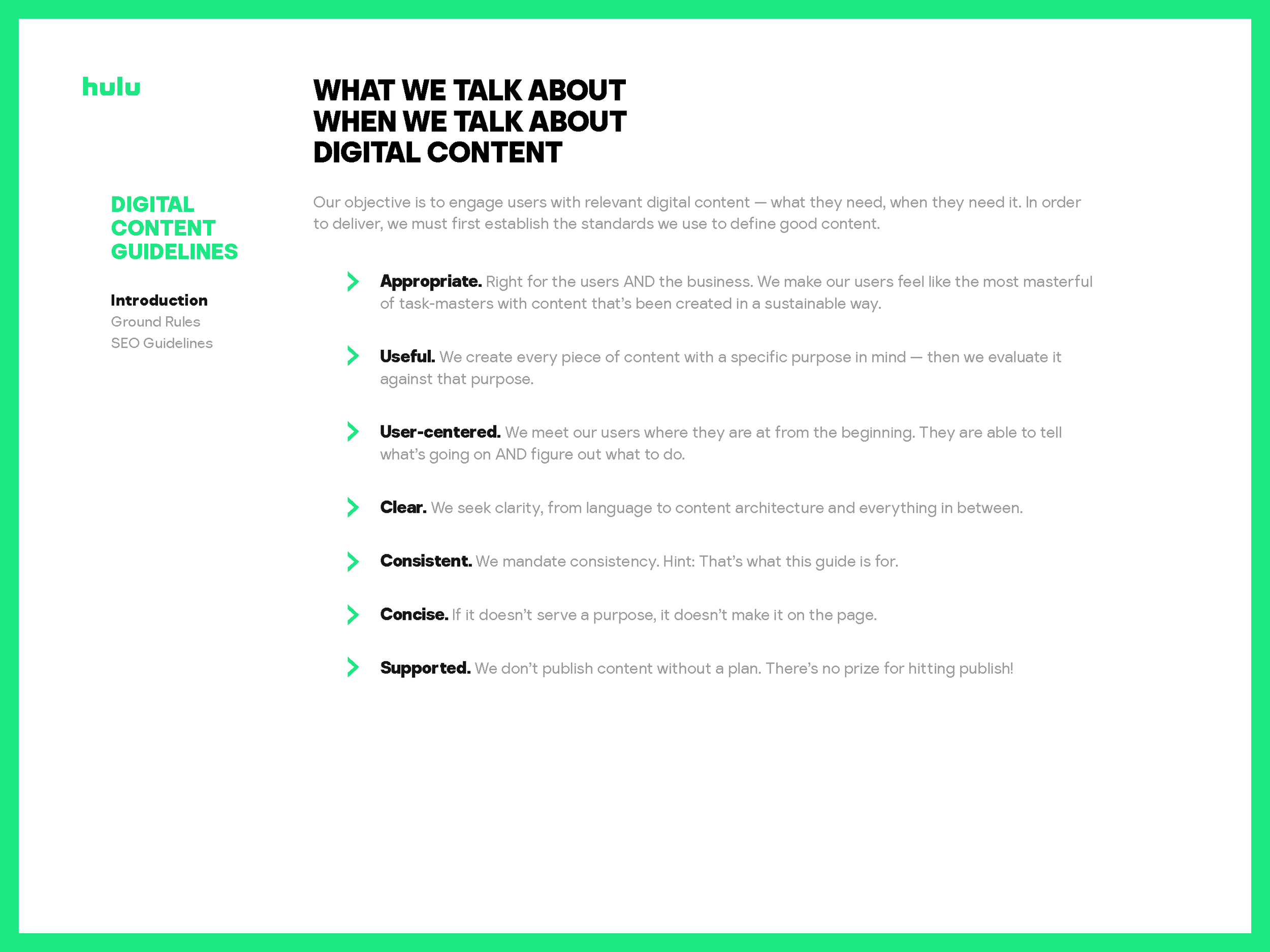 • Inspiration for the company-wide Tone of Voice and Stylebook created by Hulu's Brand and Creative teams. They realized we needed a content system that went into the specifics of how to write for all of Hulu’s channels.