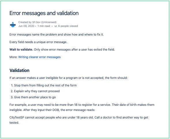 The Digital Services team is creating processes, artifacts, guidelines, and design patterns to help non-design folks in government scale their service delivery. This must be done in a user-friendly, lo-fi, and accessible way. For now, these guidelines are in Confluence. Still, as the team builds a more robust toolkit, they'll explore other ways of presenting this info so government employees from all walks of life understand how to create experiences that help San Franciscans get things done.